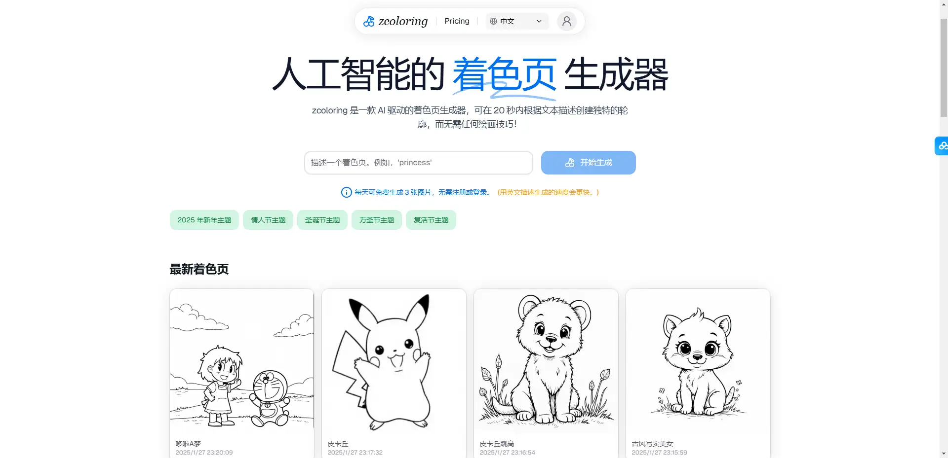 一款基于 AI 技术的着色页生成器,能够根据用户提供的文本描述快速生成独特的轮廓图,无需任何绘画技巧。用户只需输入简单的文字描述,便可在 20 秒内创建个性化的着色页。该工具每天允许免费生成 3 张图片,且无需注册或登录,使用英文描述时生成速度更快。ZColoring 旨在为儿童和成人提供无限量的个性化涂色页,带来创作乐趣和娱乐。