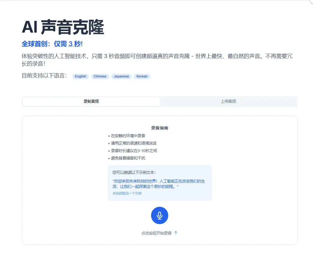 一款功能强大的超真实AI语音生成器,通过先进的文本转语音(TTS)技术,将文本高效转换为与真人声音无法区分的自然语音。用户可以使用其即时声音克隆功能,通过仅需3秒的录音创建专属AI声音。平台支持中文、英语、日语和韩语等多种语言,并提供母语级别的发音和情感表达,同时允许个性化定制声音的音调、语速和风格。适合内容创作、教育、商业配音以及娱乐制作等场景,AnyVoice 界面简洁、操作便捷,生成速度快,且输出高品质音频,满足从初学者到专业人士的需求,是提升内容吸引力和生产效率的理想工具。