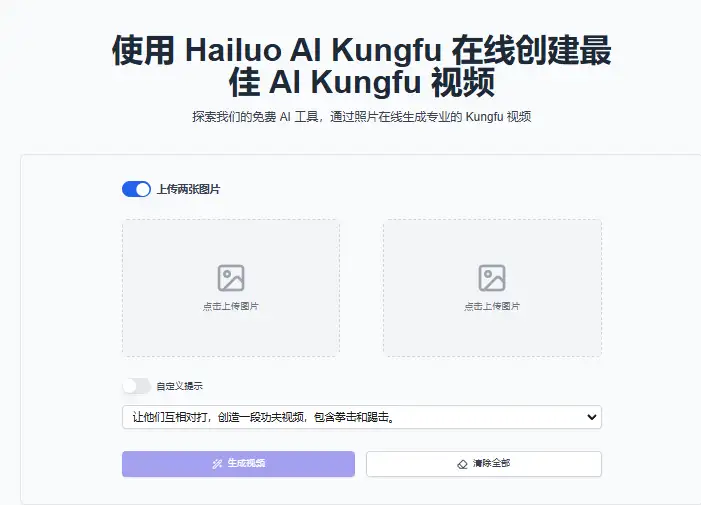 AI功夫视频生成器是一款基于Hailuo模型技术的在线工具,用户只需上传清晰的照片,即可选择传统功夫、太极动作或现代战斗场景风格,AI将自动生成高清武术动画。无论是飞拳、防守姿势还是复杂的武术招式,都能精准还原,视频质量达到影视级标准。
