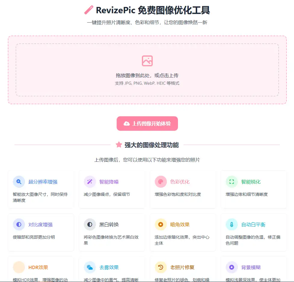 - 一款强大而简单的在线图像优化工具 ——RevizePic。它内置了 16 款 AI 功能,专为提升您的照片质量而设计。无论您是想修复老照片、增强手机拍摄的图像,还是改善扫描文档的清晰度,RevizePic 都能帮助您轻松实现。此款工具免费且不需要登录,即可对图像进行一键处理,非常的强大!绝对值得收藏。