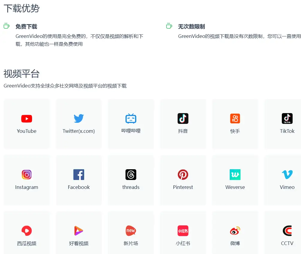 - 多平台支持 :支持 1000 + 短视频平台视频解析下载,无论是国内还是国外的热门平台,只需复制链接即可使用,满足您在不同平台下载视频的需求。