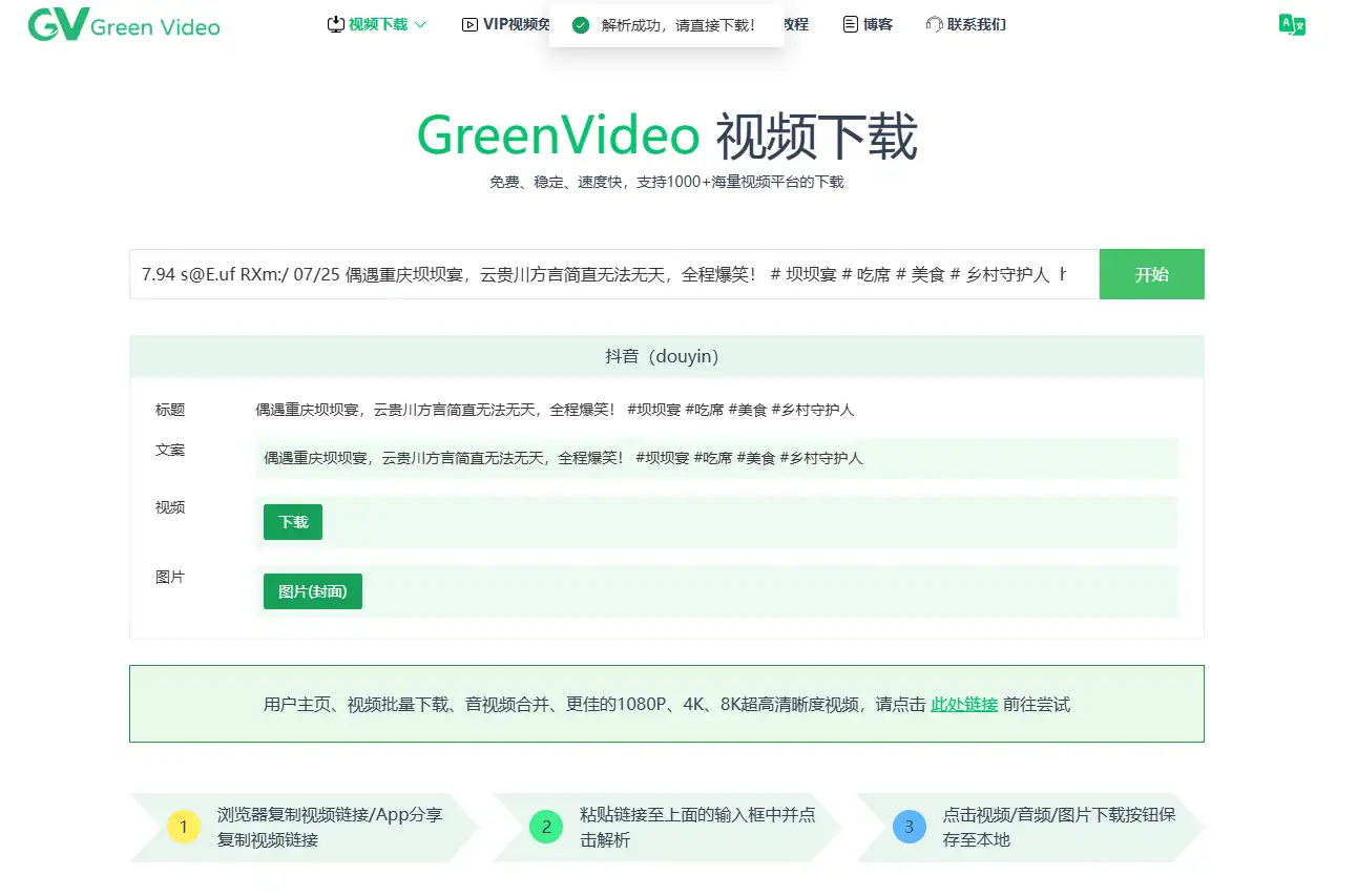 - 今天给大家推荐一款难得的短视频解析下载在线网站,它支持 1000 + 海量视频平台的下载,包括常见的 B 站、抖音、小红书、快手等,还支持一些国外平台视频解析下载,如 YouTube、X 等。复制链接即可自动解析,网站支持手机和电脑端进行使用,而且无需注册,完全免费,非常的良心。