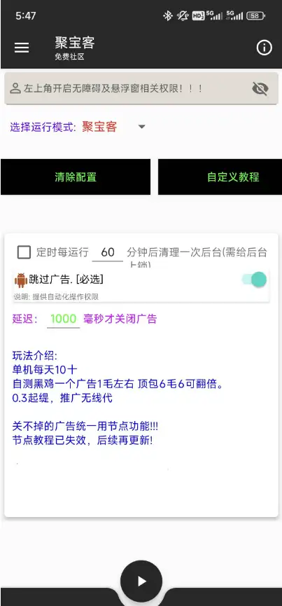 - 项目背景 :在互联网广告领域,挂机脚本已经成为一种非常流行的变现方式。通过挂机脚本,用户可以在不主动操作的情况下,自动完成广告任务,获得稳定的收益。聚宝客全自动广告挂机脚本正是这样一个高效的工具,它能够帮助用户轻松实现广告收益的自动化。