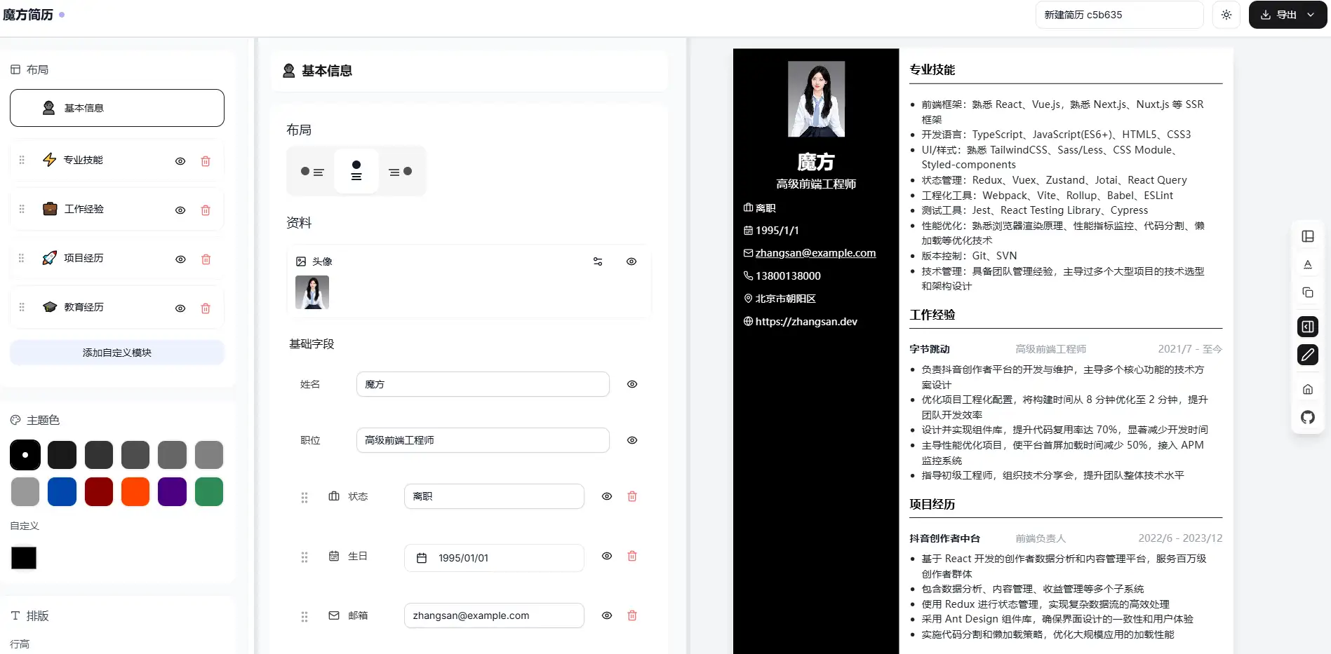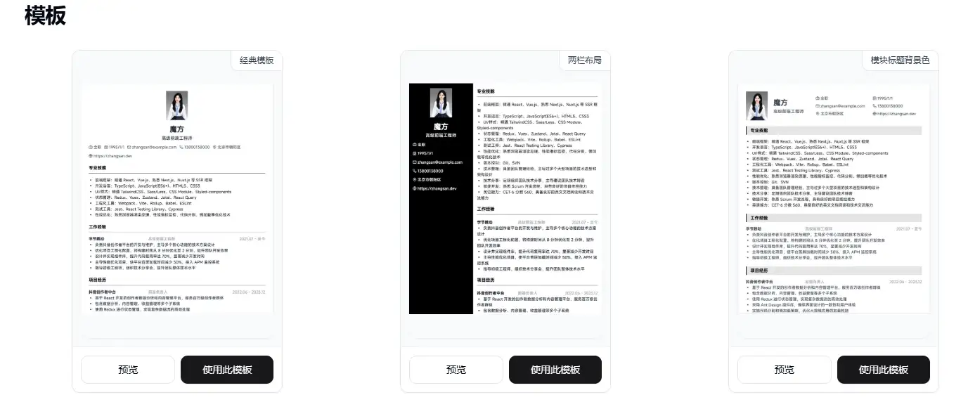魔方简历支持实时预览功能,用户在编辑简历时可以即时查看效果,确保简历的排版和内容符合预期。此外,它还支持自定义主题,用户可以根据个人喜好调整颜色、布局等,让简历更具个性。
