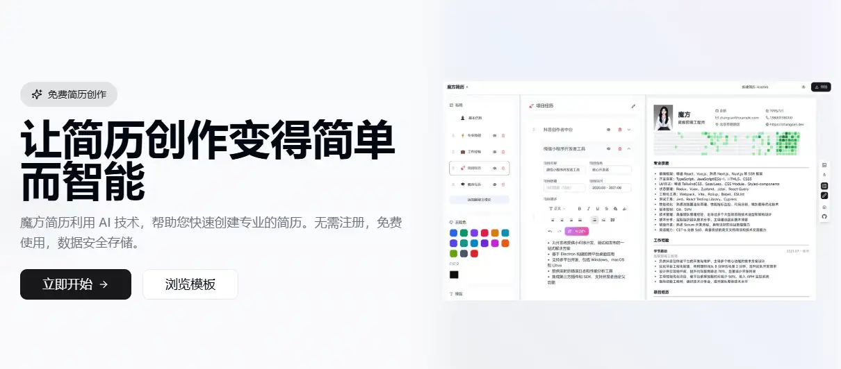 魔方简历是一款基于AI技术的在线简历制作工具,利用先进的算法和智能识别功能,帮助用户快速创建高质量的简历。它完全免费,无需注册,支持实时预览和自定义主题,所有功能均可免费使用,是求职者在求职过程中的得力助手。