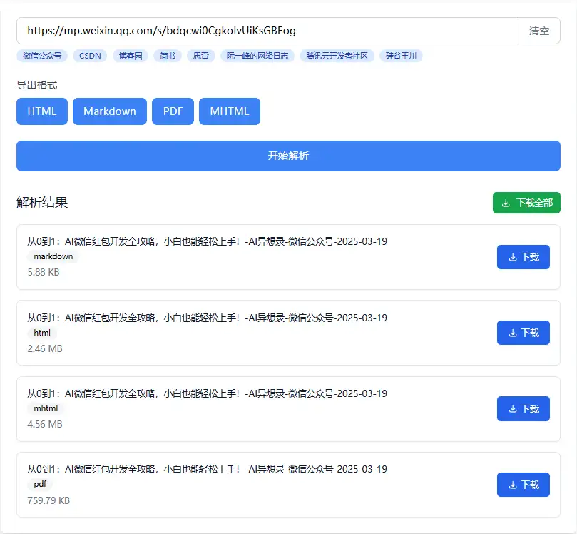 文捕工具覆盖了微信公众号、CSDN、博客园、简书、思否、阮一峰的网络日志、腾讯云开发者社区等多个平台。无论是技术博客、个人公众号文章还是其他平台的优质内容,文捕都能轻松应对,一键解析下载,满足你在不同平台间的内容获取需求。