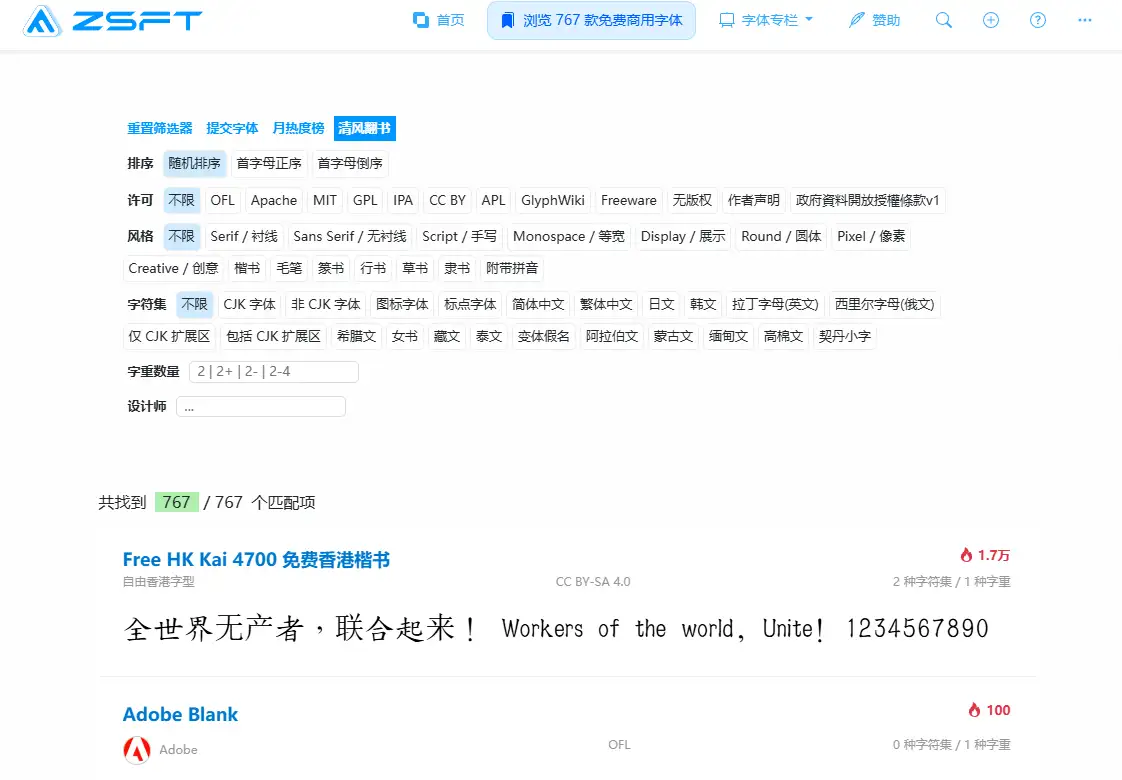 ZSFT 收录了 764款 免费商用和开放使用的字体,涵盖了多种语言和字体类型,包括简体中文、繁体中文、英文、日文、韩文等,以及衬线、无衬线、手写、像素等风格。无论是设计海报、制作网站还是编写文档,你都能在这里找到合适的字体。