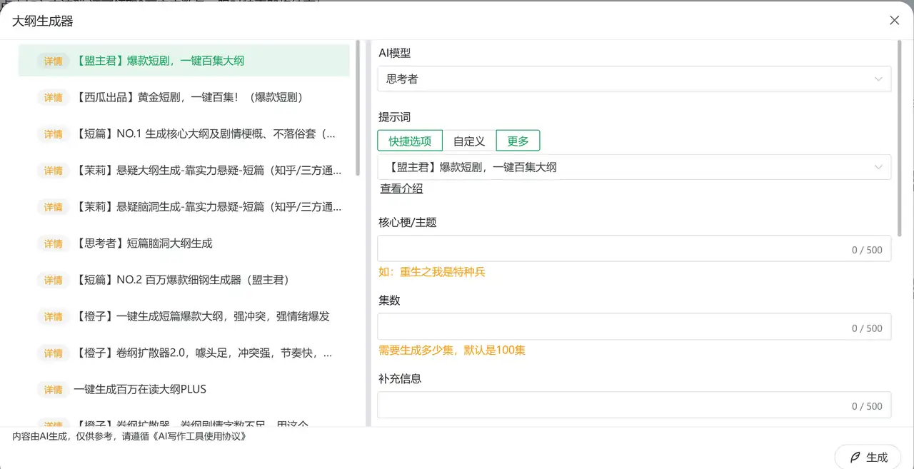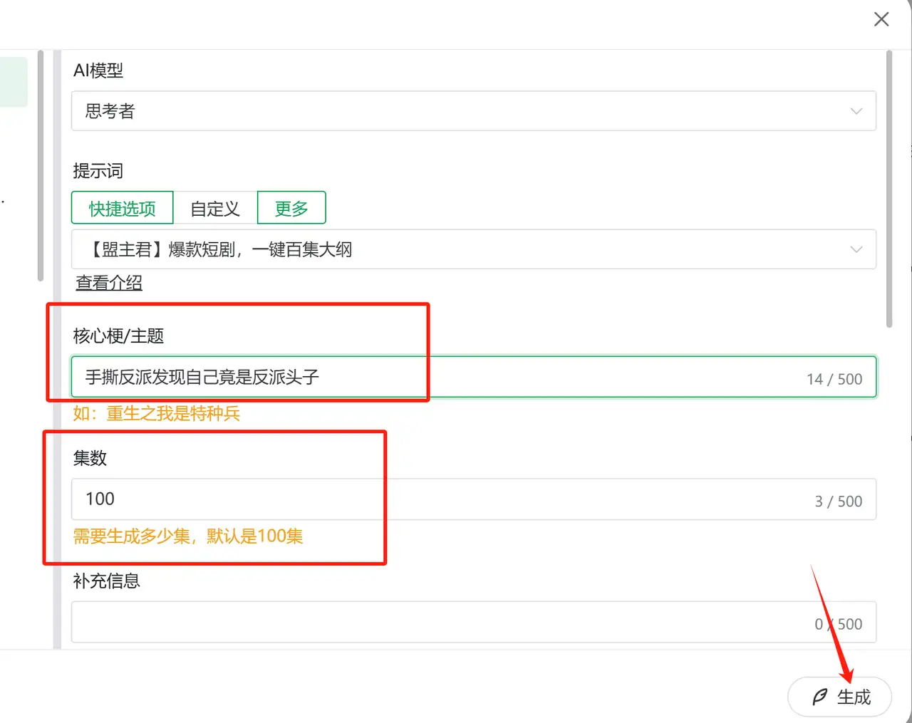 - 输入主题和关键词:根据你的创意,输入短剧的主题和关键词。例如,“校园爱情”“职场奋斗”“悬疑推理”等。