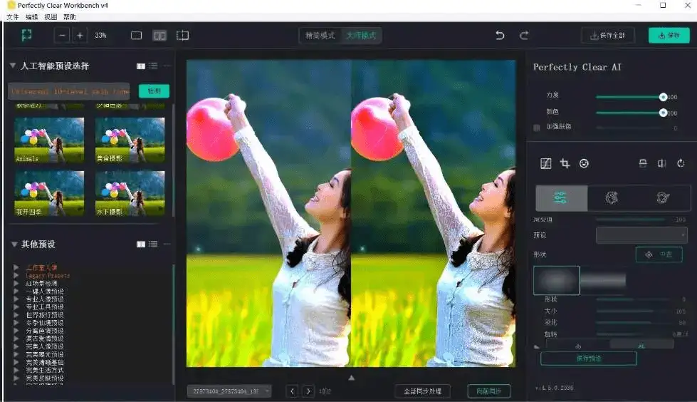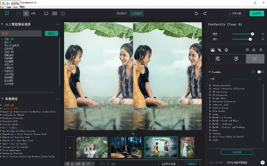 • 内置 100 + 中文定制预设:涵盖 “日系小清新”“电影感胶片”“古风工笔画” 等热门风格,每个预设附带参数说明(如高光 + 15 / 阴影 – 10 / 色温 + 5),小白也能看懂专业调色逻辑