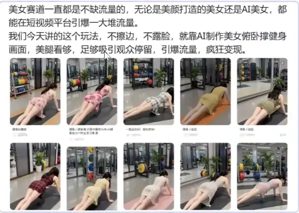 短视频平台对 “健身美女” 内容持续流量倾斜,某账号通过 AI 生成 “俯卧撑女孩” 视频,单条播放量破 50 万,30 天涨粉 6.8 万,核心在于 **“健康人设 + 运动场景 + AI 技术”** 组合 —— 无需真人出镜,通过 AI 生成合规健身画面(不露脸、无擦边),精准匹配抖音、小红书等平台的 “运动健身”“自律生活” 标签,实现低成本流量破圈。