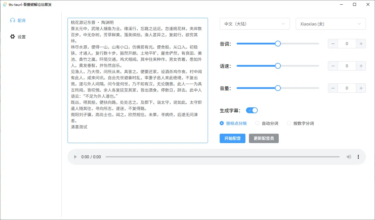 - 点击 “生成” 按钮,软件自动调用微软 TTS 引擎生成音频,同时生成带时间轴的 SRT 字幕。