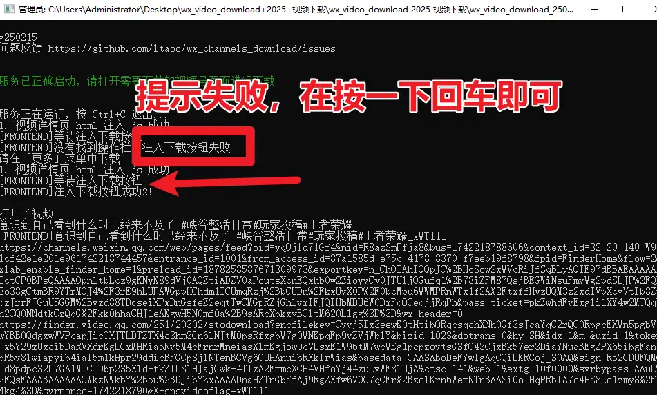 一定要管理员运行,如果提示注入失败,打开视频号,随便播放一个视频,然后在命令框内按一下enter即可注入成功