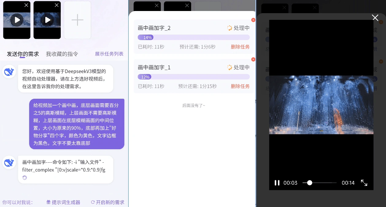 基于 DS-V3 深度学习模型,用户仅需输入 “为 30 秒短视频添加动态字幕并混剪分镜”,系统自动解析需求并生成成品,支持多线程批量处理,效率提升 300%。