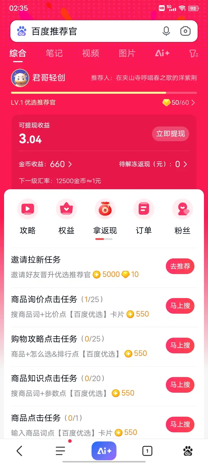- 百度优选推荐官是百度官方推出的智能购物决策平台兼零门槛副业项目,用户通过完成平台任务获取金币并兑换现金。其核心是为百度生态引流(如商品搜索、广告曝光),同时让用户通过碎片化操作赚取收益,形成双向价值闭环。