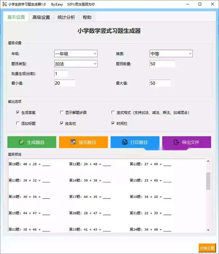 • 一款很实用的小学数学题生成工具,可生成加减乘除以及小数运算等题目,支持题目数量自定、可选择数值范围,可生成参考答案。