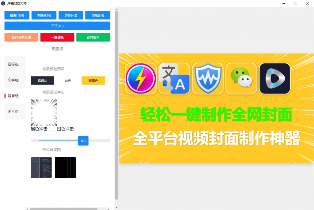 一款视频封面制作神器,使用非常简单,适合科技区软件类型UP主使用,支持B站、视频号、抖音、快手等平台封面使用,可以一键导入软件图标,然后对图标进行位置拖到,支持轻松编纂字体,自定义字体颜色等,附带背景图,一键制作出满意的封面。