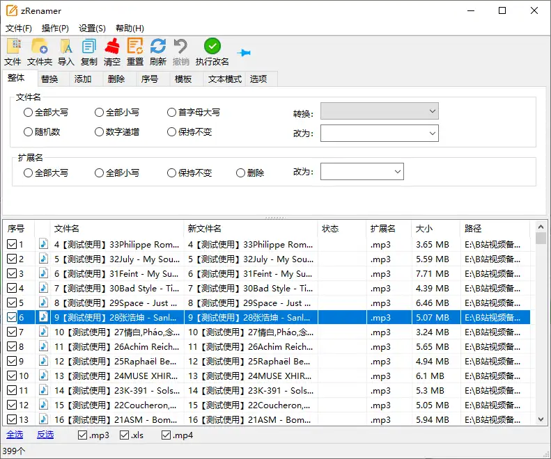 - 支持提供序号、插入、删除、替换、模板等多种常用改名方式,还支持正则替换删除,能精确修改文件名