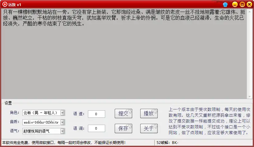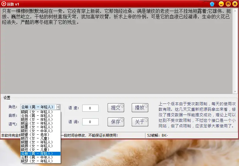 - 内置了多种角色,可选择语气、音质、语速、音调等,转换成后可试听,