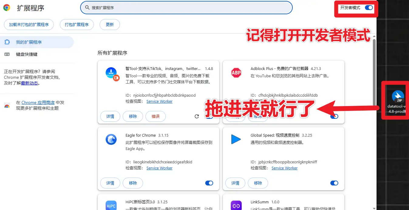 提供的是浏览器zip插件包,直接打开浏览器拓展功能,打开开发者模式,将压缩包拖进来就安装好了