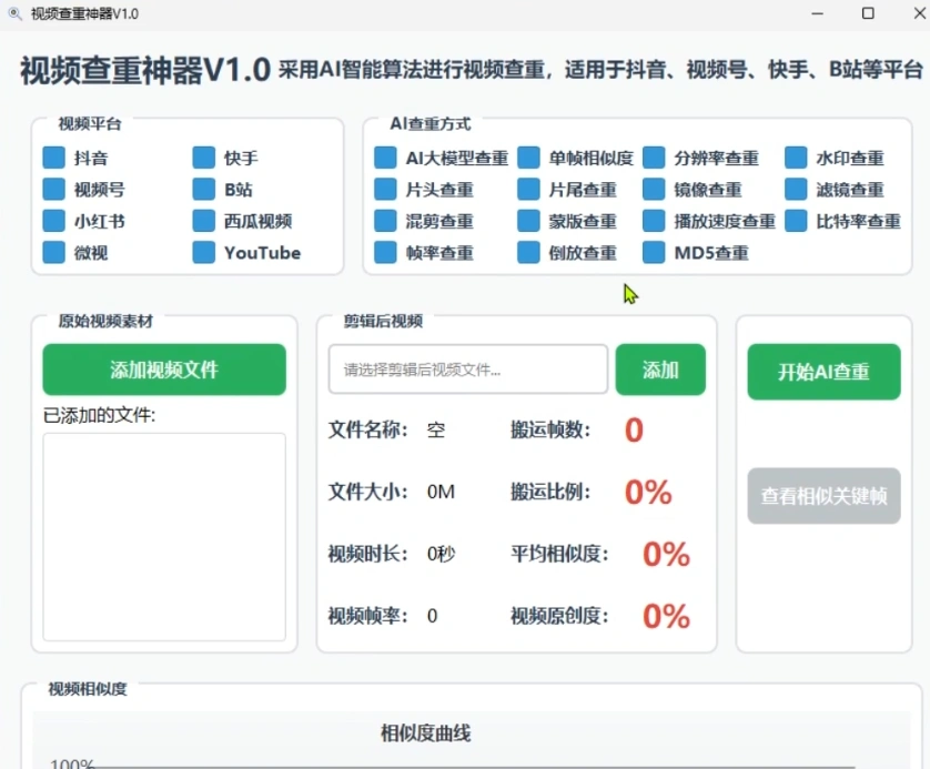 做混剪怕查重、担心账号违规?这款 AI 视频查重神器必须安排上!支持抖音、快手、B 站、视频号、小红书等主流平台,核心功能直接拉满👇