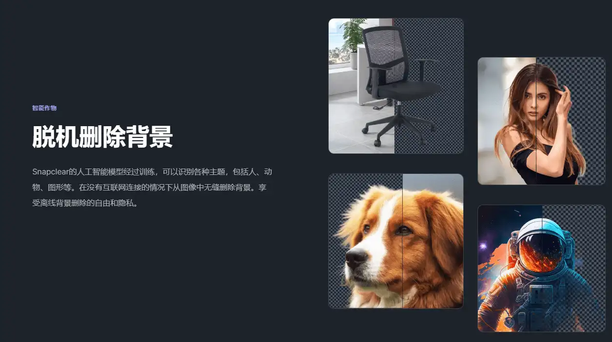 - Snapclear 的 AI 模型经过训练,可以识别各种主体,包括人物、动物、图形等。您可以无缝地从图像中移除背景,无需互联网连接